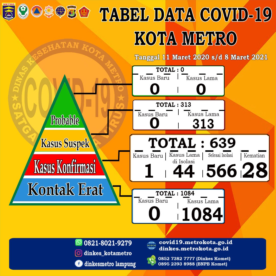 Berdasarkan dari Dinas Kesehatan Kota Metro menginformasikan bahwa, sebanyak 14 warga Kota Metro yang terkonfirmasi Positif Covid-19, Selasa (09/03/2021). P640 atas nama Ny. ZJ, 28 umur tahun Warga Imopuro, Metro Pusat. Dengan kronologi mengeluh demam, pada tanggal 1 Maret melakukan rapid antigen dan tanggal 7 Maret hasilnya positif , saat ini menjalani isolasi di rumah….