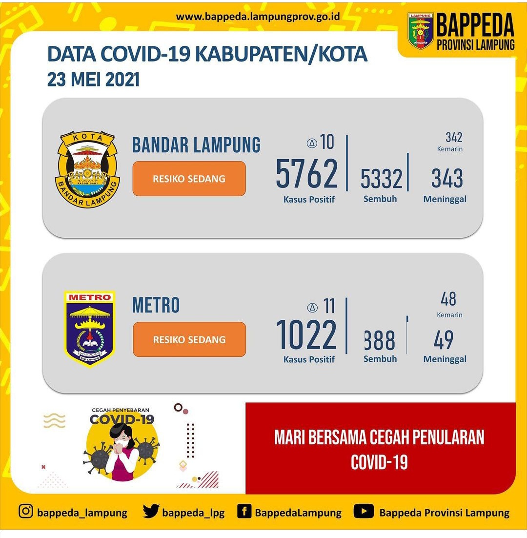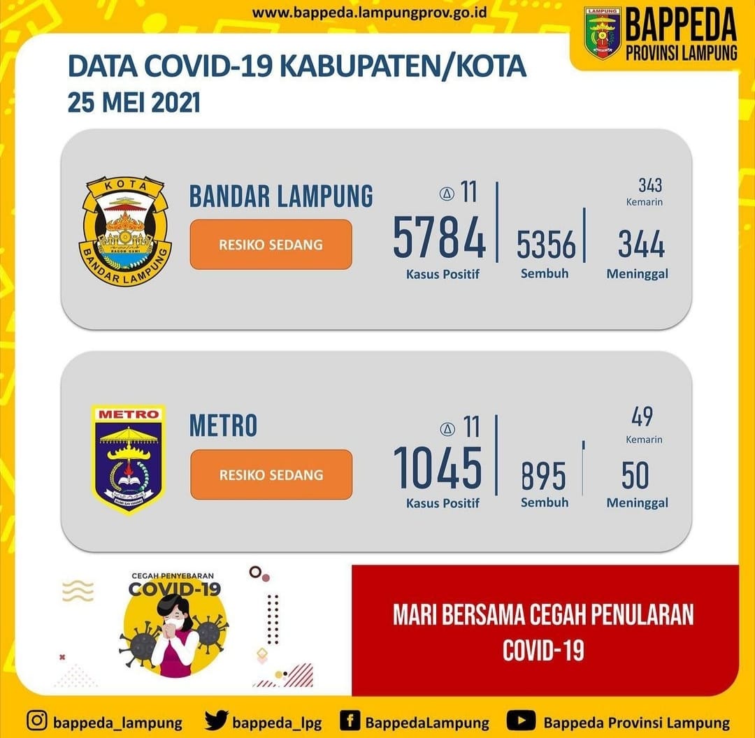 Rabu, (26/05/2021). Pasien Covid 19 di Kota Metro kembali bertambah. Hari ini bertambah 11 orang, sehingga jumlah sembuh sebanyak 903 orang sehingga jumlah total kasus sebanyak 1.056. Adapun kronologis pasien :Pasien 1046; K, 58thPasien 1047; A, 40thPasien 1048; YW, 37thPasien 1049; LW, 26thBanjarsari Metro Utara Kota Metro.Kronologis berempat ibu dan anaknya merupakan istri dan anak…