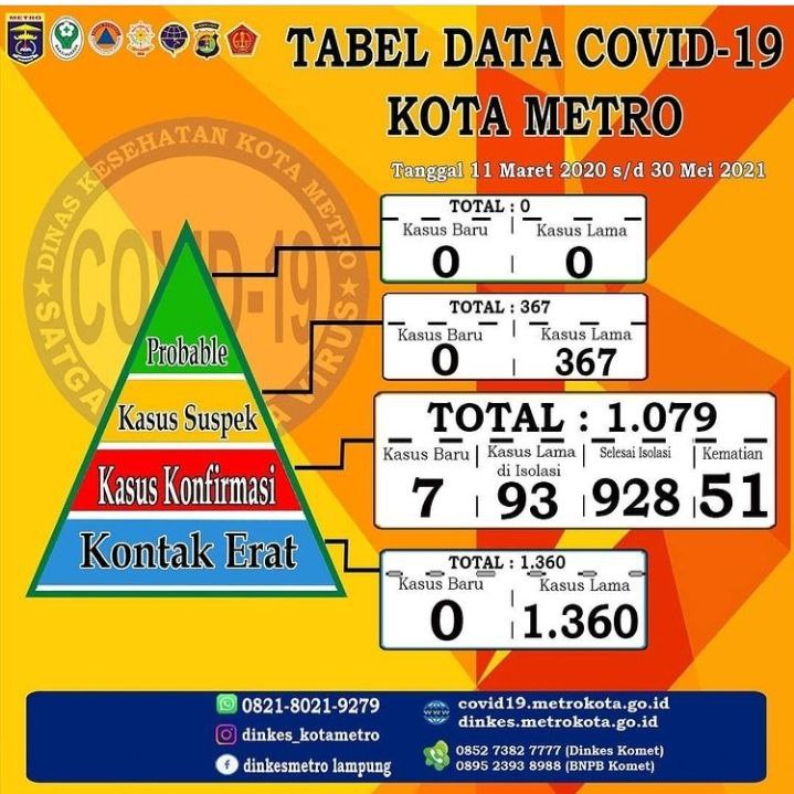Kembali Kota Metro terjadi penambahan kasus konfirmasi Covid-19, per tanggal 30 Mei 2021 jumlah keseluruhan kasus mencapai angka 1.079 kasus, diantaranya 7 kasus baru, 93 kasus lama di isolasi, 928 selesai isolasi, dan 51 kematian. Adapun 7 penambahan kasus baru tersebut adalah P1073 A S W (46) warga Yosorejo Metro Timur Kota Metro. P1074 S…
