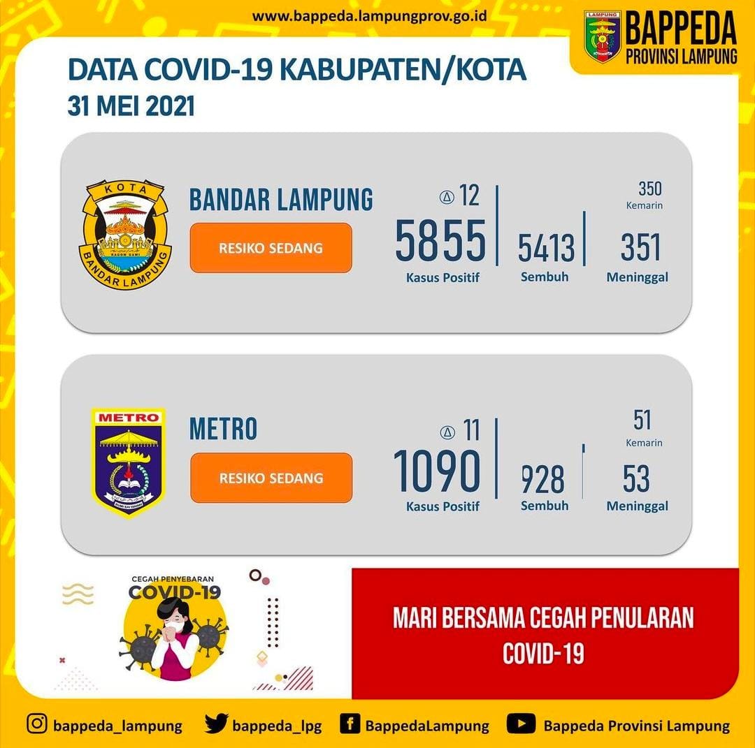 Bertambahnya kasus baru konfirmasi Covid-19 di Kota Metro, kini angka total keseluruhan kasus hingga per tanggal 24 Mei 2021 mencapai angka 1.034 Kasus. Penambahan 12 kasus tersebut diantaranya P1023 CW (53) warga Imopuro Metro Pusat Kota Metro, P1024 SHEJ (24) warga Kelurahan Metro Kec Metro Pusat Kota Metro, P1025 F BAW (31) warga Kelurahan Metro…