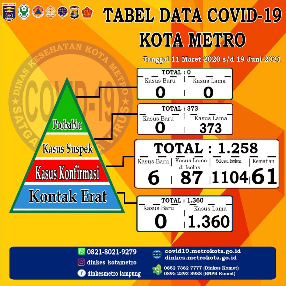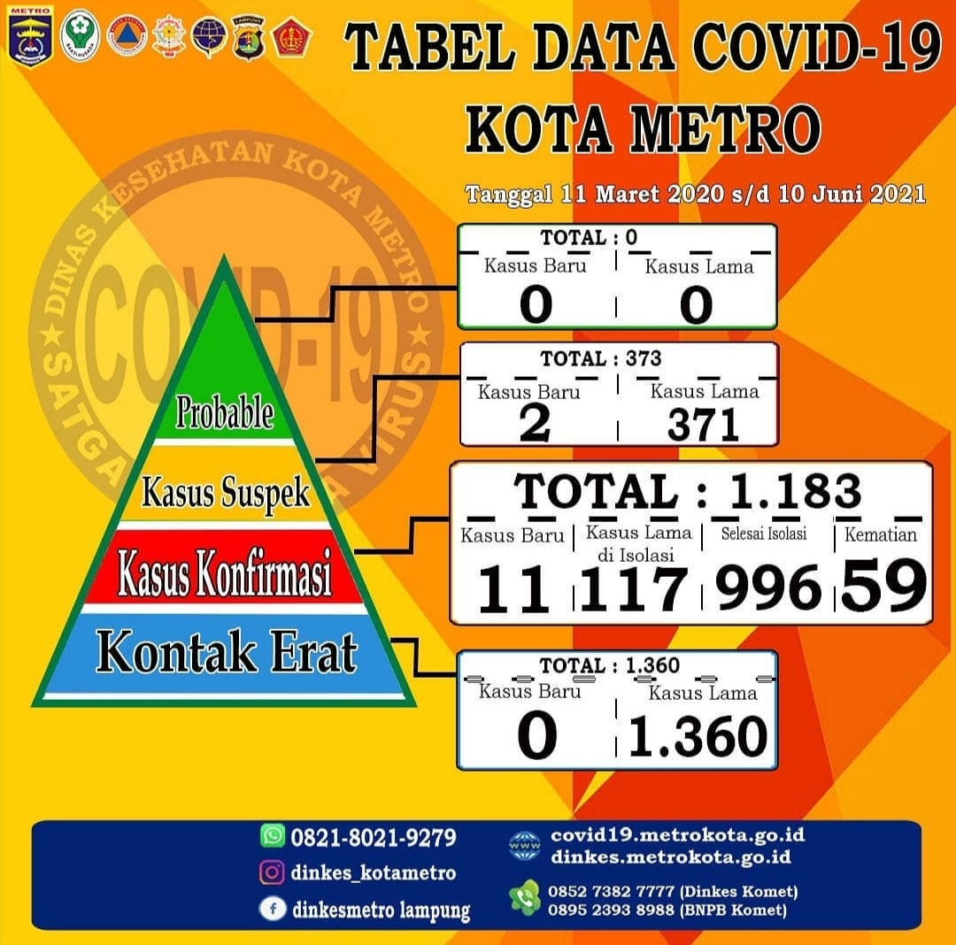 Penambahan kasus konfirmasi covid-19 di Kota Metro sebanyak 11 orang, jumlah sembuh 994 dan jumlah total kasus 1.183, Kamis (09/06/2021). P1173; RN, 34 tahunAlamat :Jl Merica RT.033/015. Kronologis wiraswasta. Beberapa waktu lalu pernah bertemu dengan keluarga dari luar Metro yan terkonfirmasi. Tanggal 2 Jani diswab dan tanggal 8 Jani hasil positif. Isolasi mandiri. P1174; DAA,…