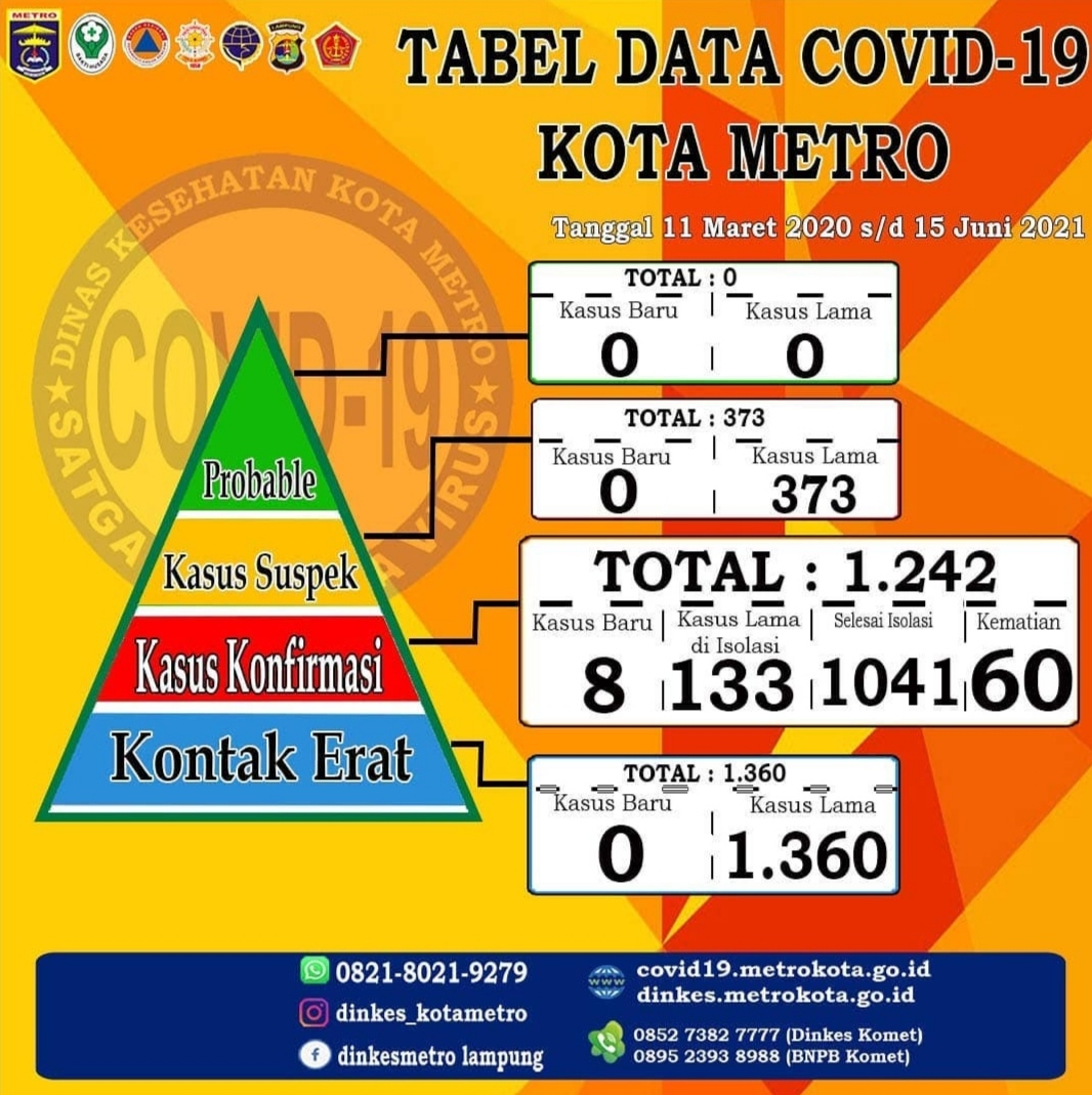 Per tanggal 15 Juni 2021, terjadi penambahan kasus baru terkonfirmasi Covid-19 di Kota Metro sebanyak 8 orang. Dengan penambahan tersebut, kini total keseluruhan kasus mencapai 1.242 kasus. 8 kasus baru tersebut diantaranya : P1235; Y,. 55th. Warga Tejoagung Metro Timur Kota Metro. P1236; R RH, 46th. Warga Mulyojati Metro Barat Kota Metro. P1237; R, 72th,…