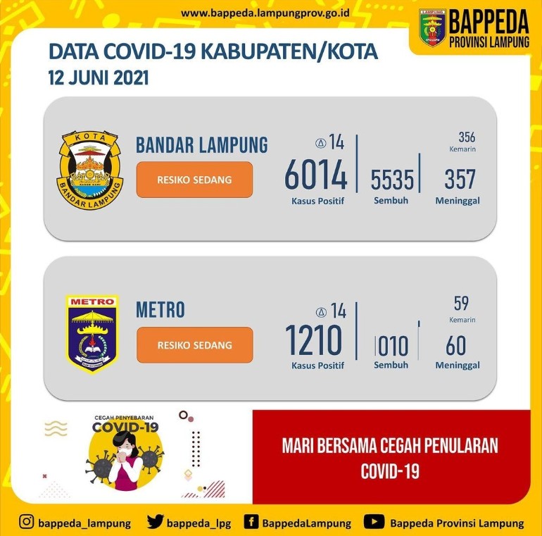 Rabu (09/06/2021), Kasus Konfirmasi Covid-19 Kota Metro kembali bertambah, per tanggal 09 Juni 2021, total keseluruhan sebanyak 1172 kasus. Adapun 12 kasus baru tersebut diantaranya P1161: SB 50th warga dari Kel Metro Kec Metro Pusat Kota Metro, P1162 AK 46th dan P1163 PS 44th yang merupakan suami-istri warga dari Kel Metro Kec Metro Pusat Kota…